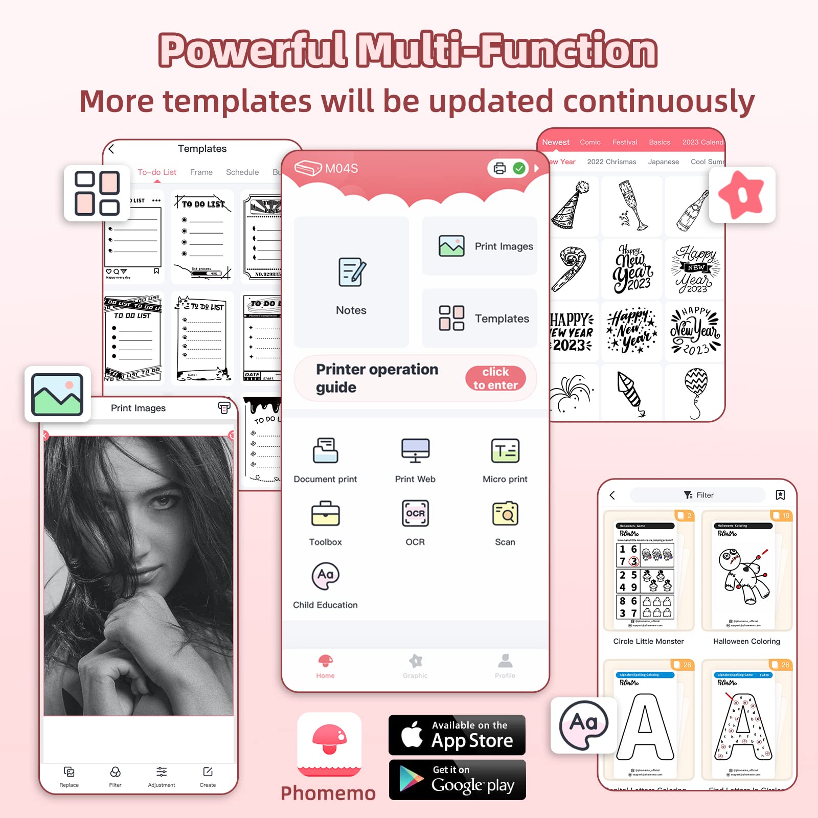 - Multi-Functionality App: Phomemo M04S inkless sticker printer is compatible with iOS & Android, phone & pad, download ''Phomemo'' app and connect the printer within app, you can print photos, web pages, documents, Word, TXT, PDF, labels, etc. Support 11 national languages, 50+ fonts, hundreds of free patterns can be used, and updated monthly